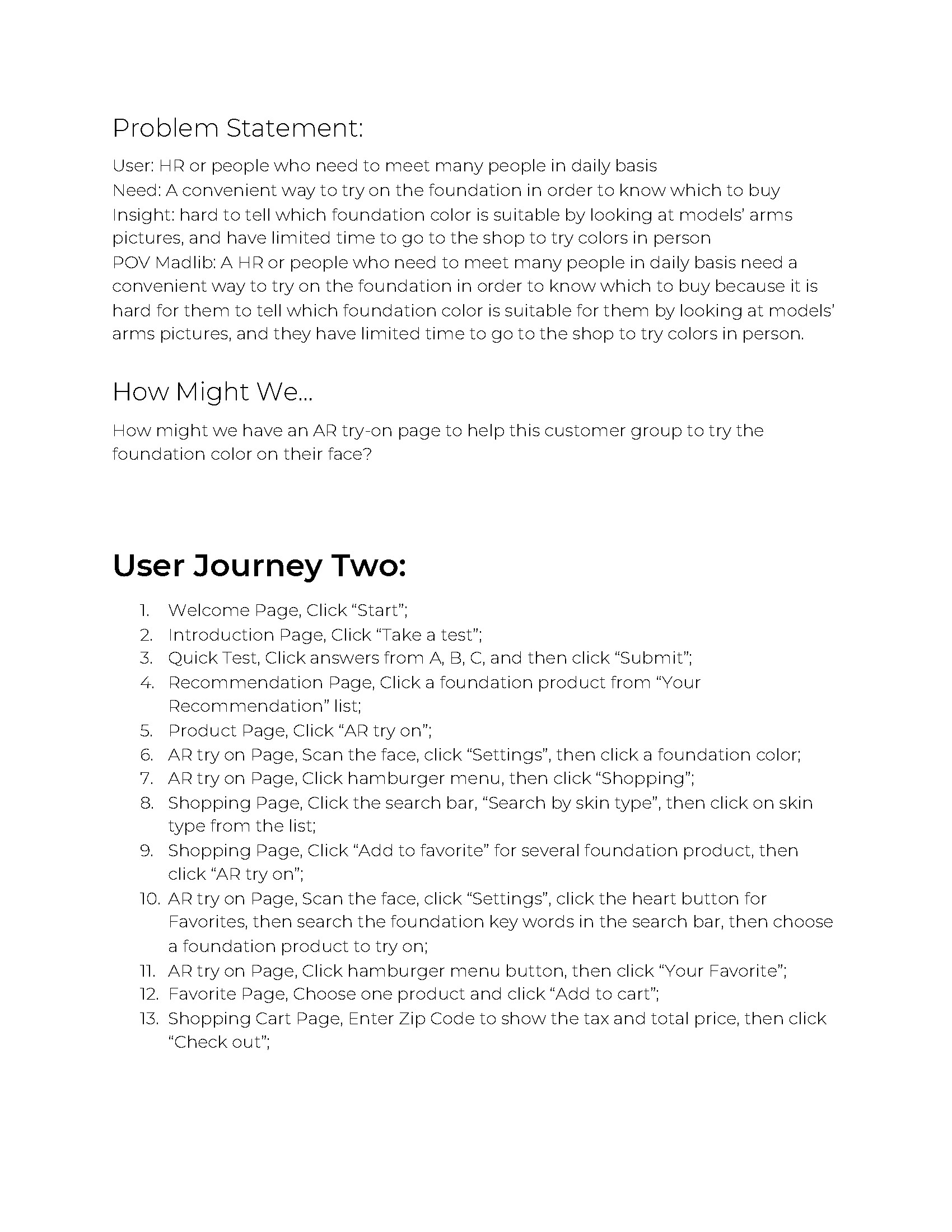I came up with 3 personas for different identities of females, and 3 user journeys respectively. Because I want to have those who will heavily use the AR function as my clients, and make this app suitable for as many people as possible, I finally chose my second persona, Jessica, a 28 years old HR. Full document can be checked via this link: